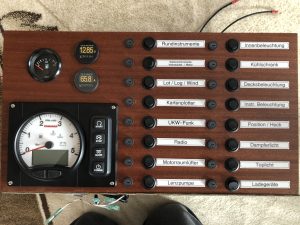 Die neue Hauptschalttafel, jetzt mit Drehzahlmesser und digitalen Anzeigen für Spannung und Strom, ist inzwischen auch fertig.. |