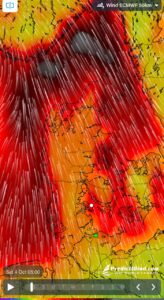 | Sturm ist nur von vorne blöd. Achterlich gehts gut…Ziemlich viel dunkelrot auf der Windkarte. |