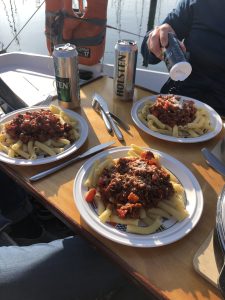 Die Nudeln abschütten, Achtung, nicht zu lange kochen, und zusammen mit der Bolognese-Sauce und dem Parmesan servieren.